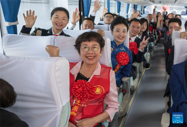 Representatives attending a gathering to commend role models with disabilities and people who have made outstanding contributions in helping those with disabilities head for the venue of the gathering in Beijing, capital of China, May 16, 2025. The gathering was held in Beijing on Friday. A total of 200 role models with disabilities, along with 200 outstanding units and 60 exceptional individuals supporting disability services, were honored at the gathering. [Xinhua/Cai Yang]