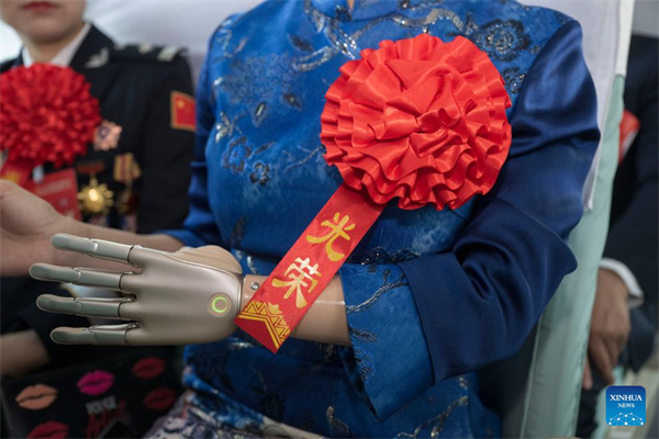 Representative Zhang Chaofan, who wears a bionic arm, heads for the venue of a gathering to commend role models with disabilities and people who have made outstanding contributions in helping those with disabilities in Beijing, capital of China, May 16, 2025. The gathering was held in Beijing on Friday. A total of 200 role models with disabilities, along with 200 outstanding units and 60 exceptional individuals supporting disability services, were honored at the gathering. [Xinhua/Cai Yang]